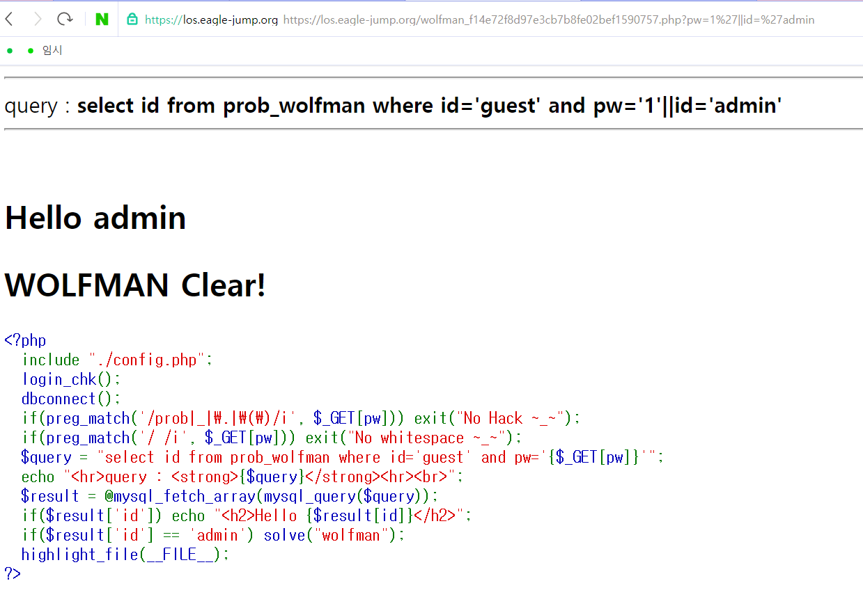 그럼 구문은 ?pw=1'||id='admin 가 될것이다.