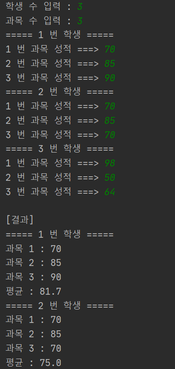 print("과목 %d 번 평균 성적:%.1f" % (i+1,subavg))