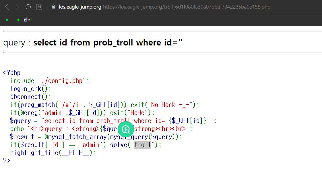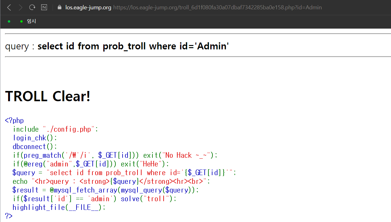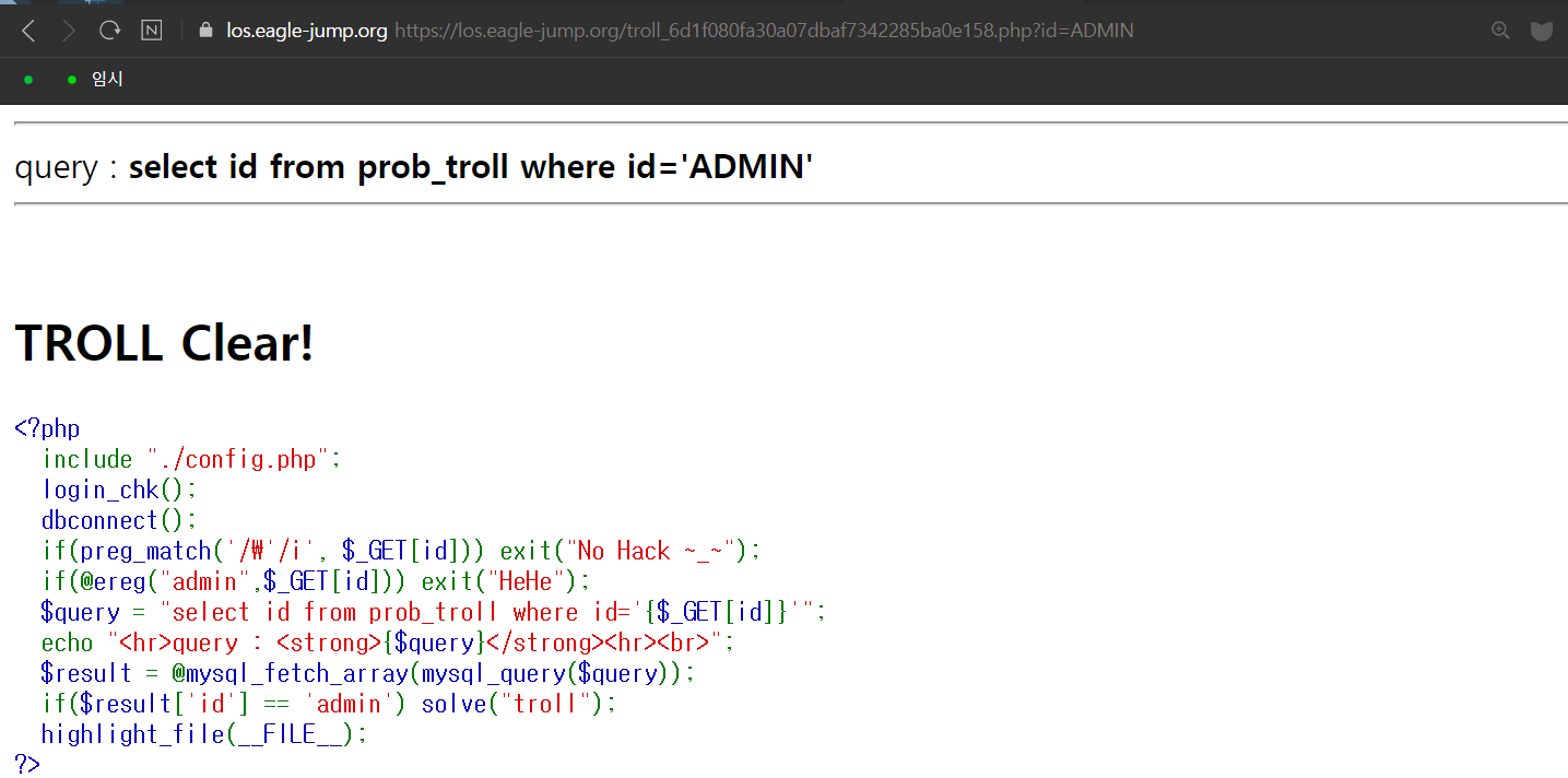 쿼리문에서는 id=admin이 되어야 troll가 뜨네요!!