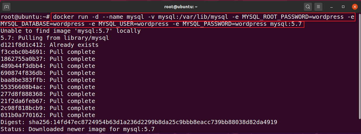5. “docker run -d --name mysql -v mysql:/var/lib/mysql -e MYSQL_ROOT_PASSWORD=wordpress -e MYSQL_DATABASE=wordpress -e MYSQL_USER=wordpress -e MYSQL_PASSWORD=wordpress mysql:5.7” 명령어를 수행하여 mysql을 설치해준다.
