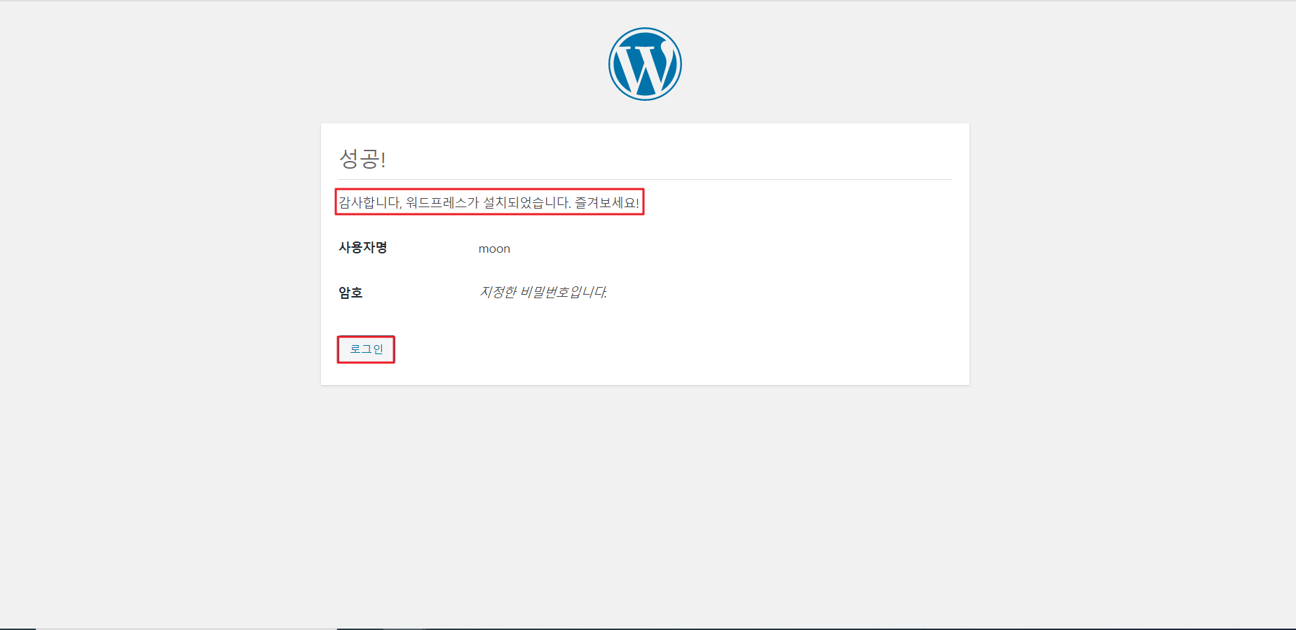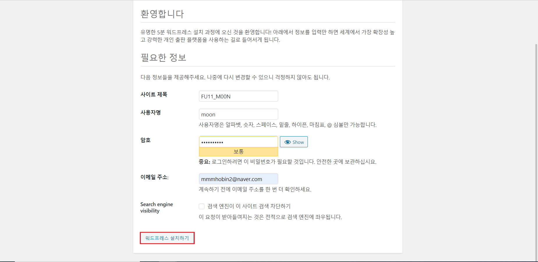 9. 사이트 제목, 사용자명, 암호, 이메일 주소의 값을 넣어준 뒤 워드프레스를 시작한다.