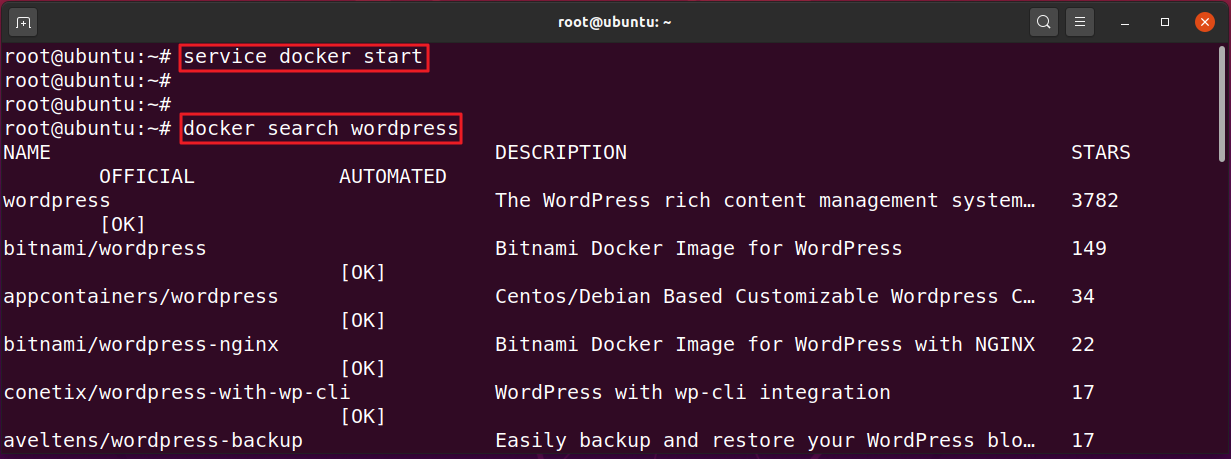 3-1. 저는 wordpress를 설치하고싶기때문에 "docker search wordpress" 명령어를 수행하여 wordpress를 찾았습니다.