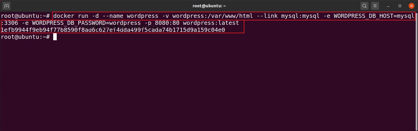 6. "docker run -d --name wordpress -v wordpress:/var/www/html --link mysql:mysql -e WORDPRESS_DB_HOST=mysql:3306 -e WORDPRESS_DB_PASSWORD=wordpress -p 8080:80 wordpress:latest"