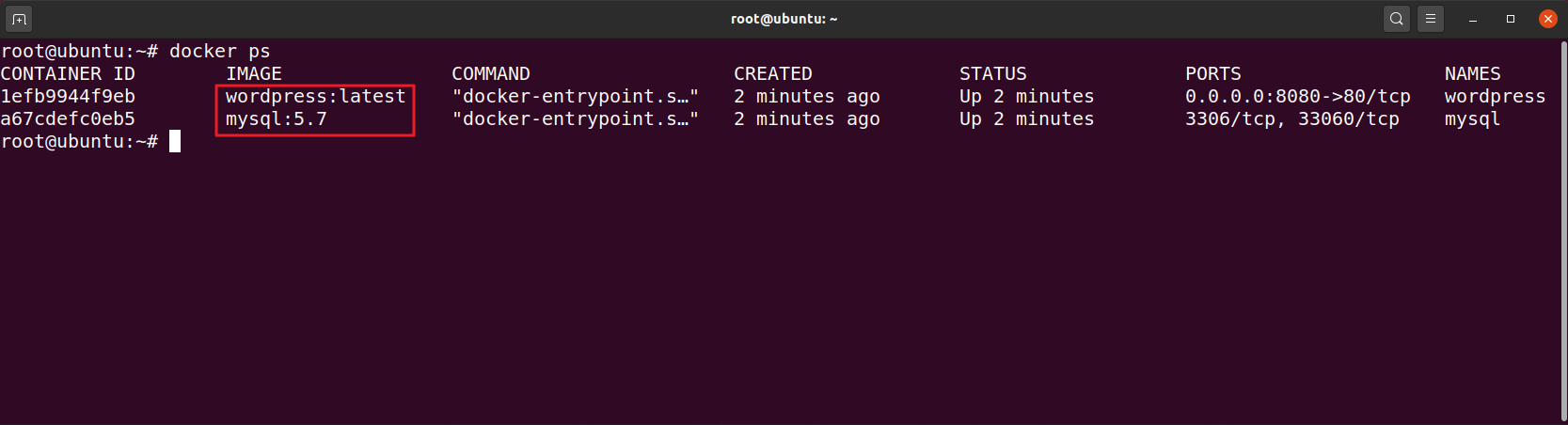 “docker ps” 명령어를 수행하여 현재 실행중인 wordpress 컨테이너와 mysql 컨테이너를 확인할 수 있다.