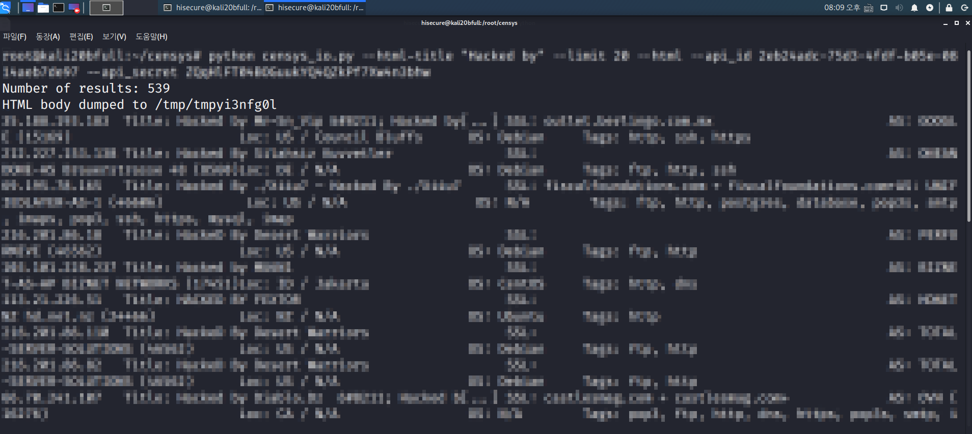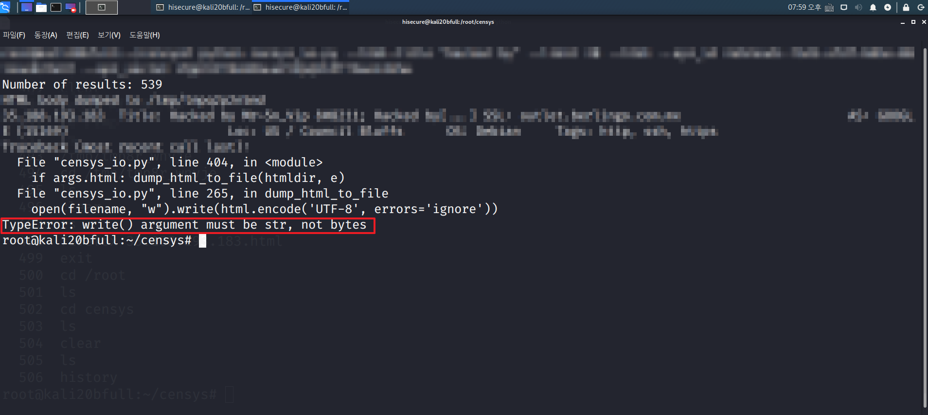 칼리 리눅스에서 censys를 공부하던 도중 어떠한 사이트를 html화 시켜서 가져오는 명령어를 입력하였는데