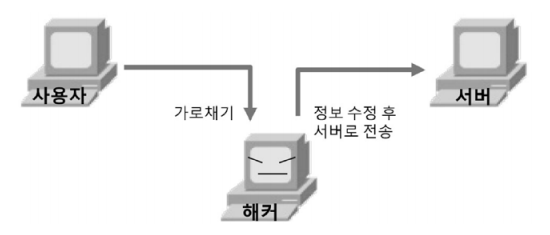 사용자가 다른 사용자 혹은 서버 간의 통신을 해커가 중간에 가로채기(Sniffing)해 정보를 수집하거나 악의적인 의도로 수정(Spoofing/Hijacking) 하는 방식
