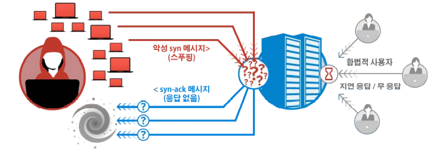 - TCP의 연결 설정의 특징을 이용해 시스템을 마비시키는 공격