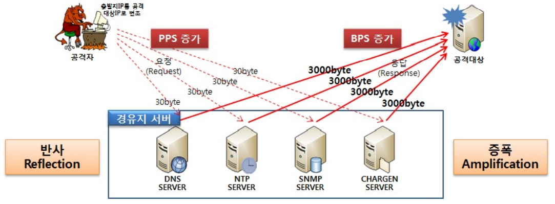 별도의 에이전트 설치 없이 네트워크 통신 프로토콜 구조의 취약성을 이용해 정상적인 서비스를 운영하고 있는 시스템을 DDoS공격의 에이전트로 활용