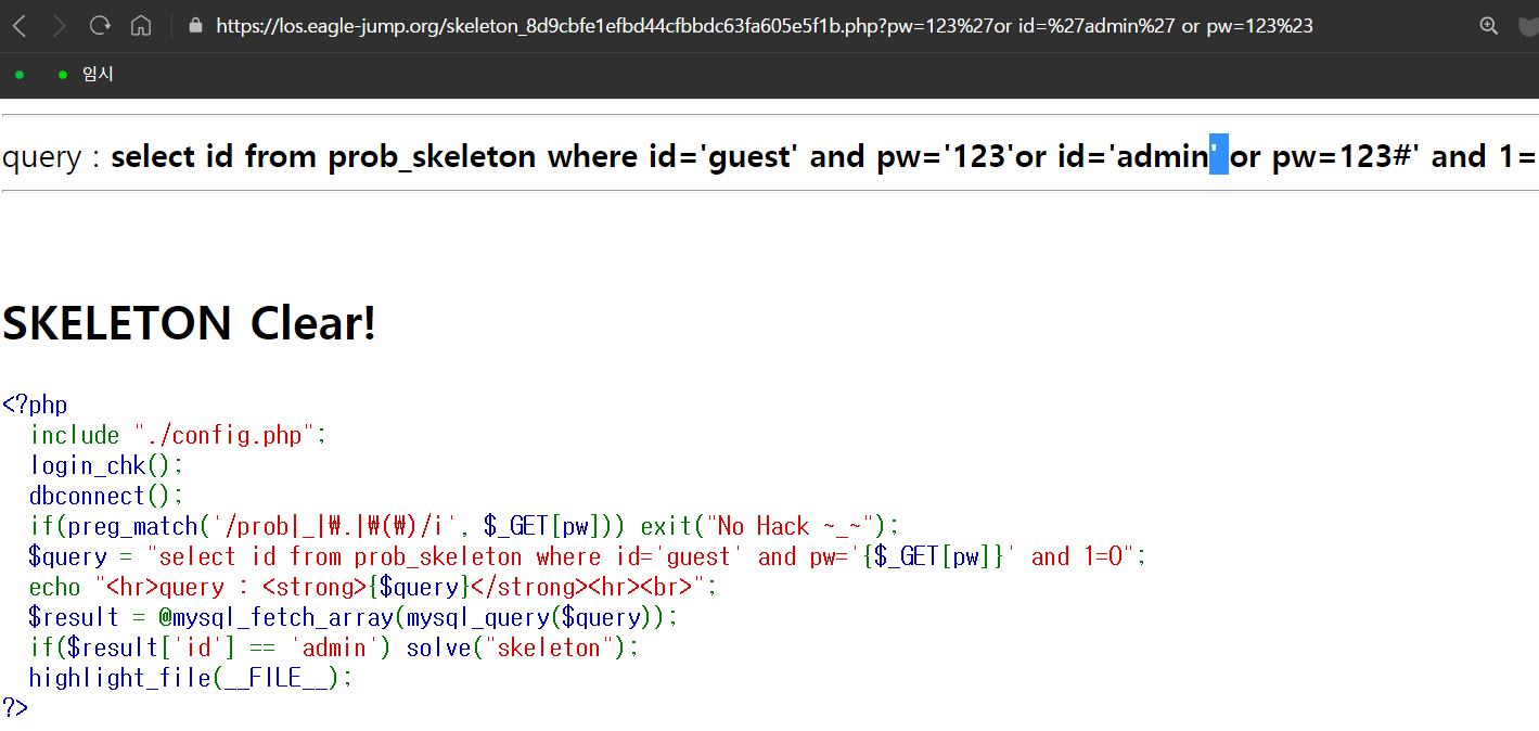 제가만약에 ?pw=1111' or id='admin' 적어준다면 저것 자체는 참이지만