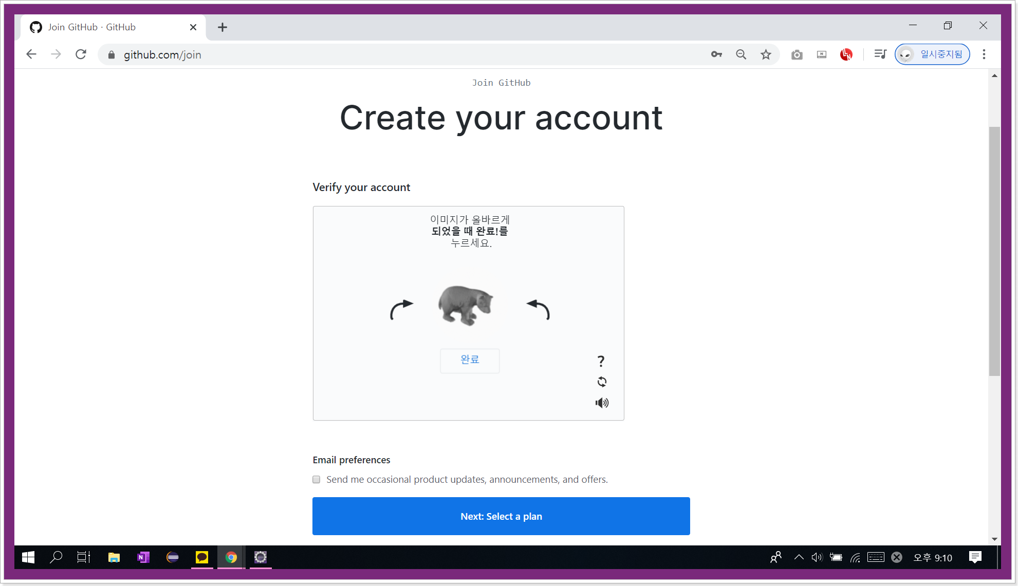 Username, e-mail, Password 칸을 채우시고 SignUp for Github 버튼을 누릅니다.