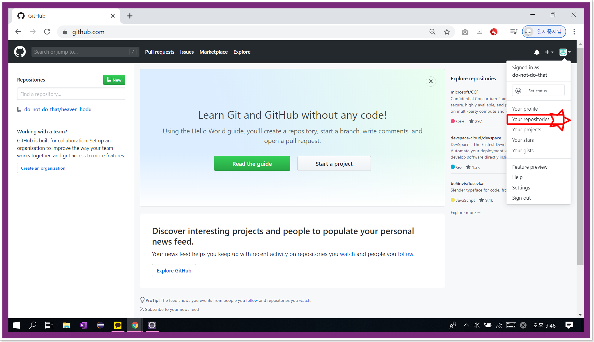 만들어진 repo는 자신의 프로필 클릭하고 Your Repositories 누르면 들어갈 수 있어요!