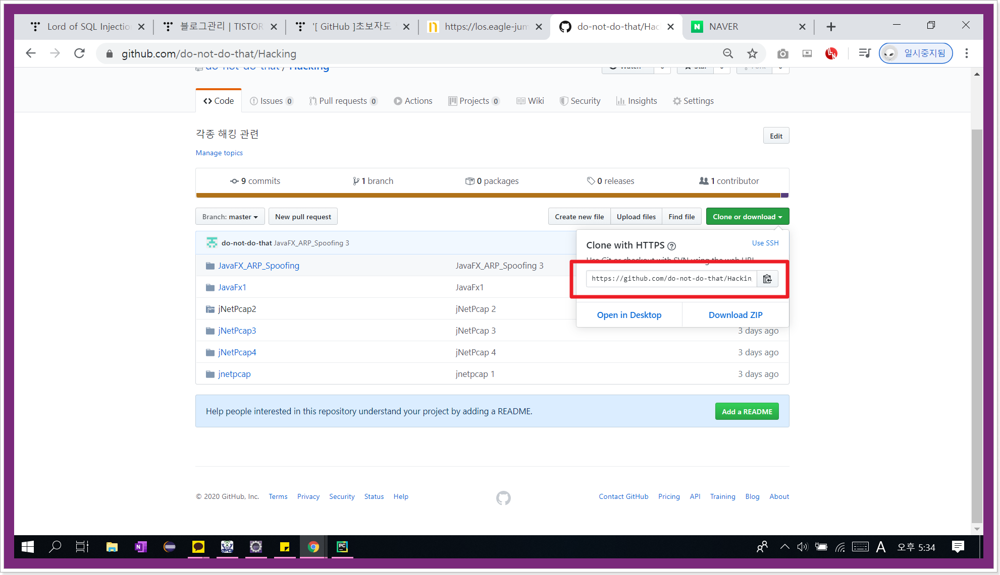 물론 화면에 보이는 Clone or download라는 초록색 버튼을 눌러도 자신의 깃 레포지토리 주소가 보입니다.