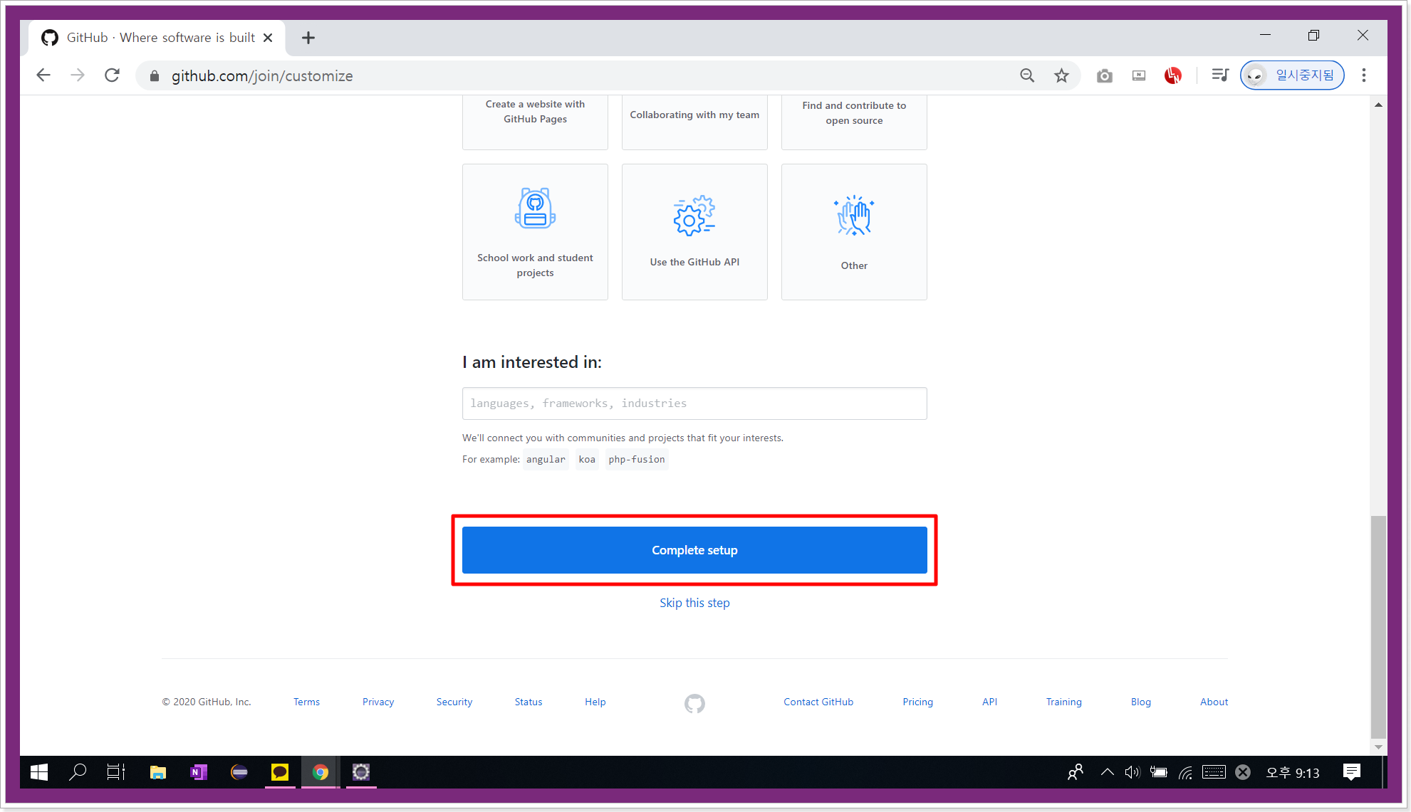 Complete Setup을 눌러주면 자신의 메일 계정에 깃허브가 보낸 메일이 옵니다. 인증해주면 가입은 완료