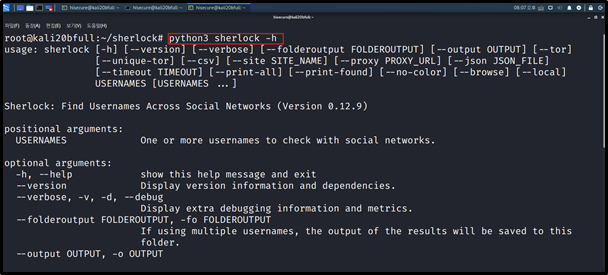 “python3 sherlock -h” 명령어를 입력하면 sherlock에서 제공하는 옵션들을 확인할 수 있습니다.
