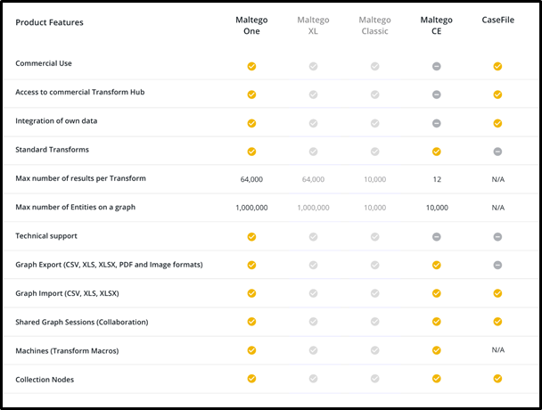 현재 사용 가능한 Maltego Client의 버전 Maltego Classic, XL, CE의 주요 차이점은 단일 변환에서 반환할 수 있는 개체 수와 단일 그래프에 존재할 수 있는 최대 개체 수입니다.