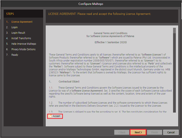 라이선스를 선택하는 창이 출력이 된다. Maltego CE(Free)를를 선택해 제한된 API를 포함하는 라이선스를 사용합니다.
