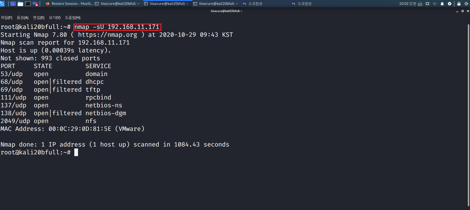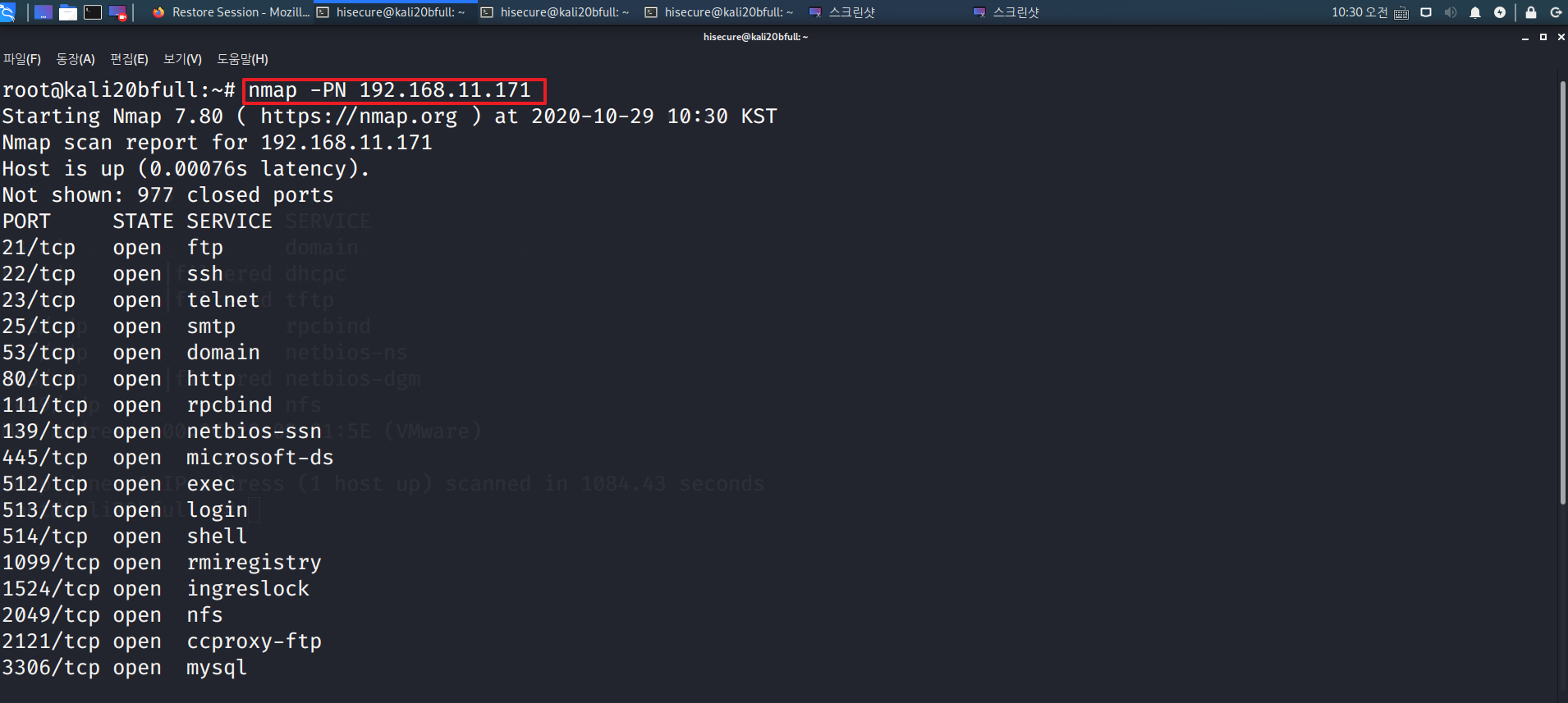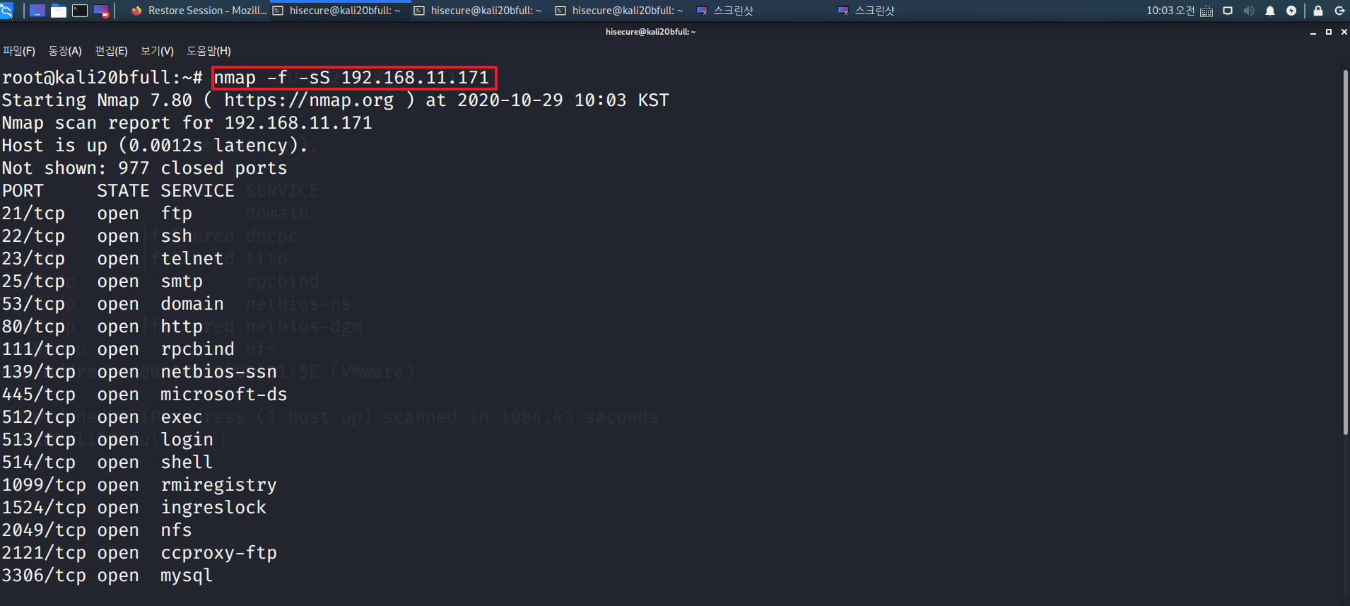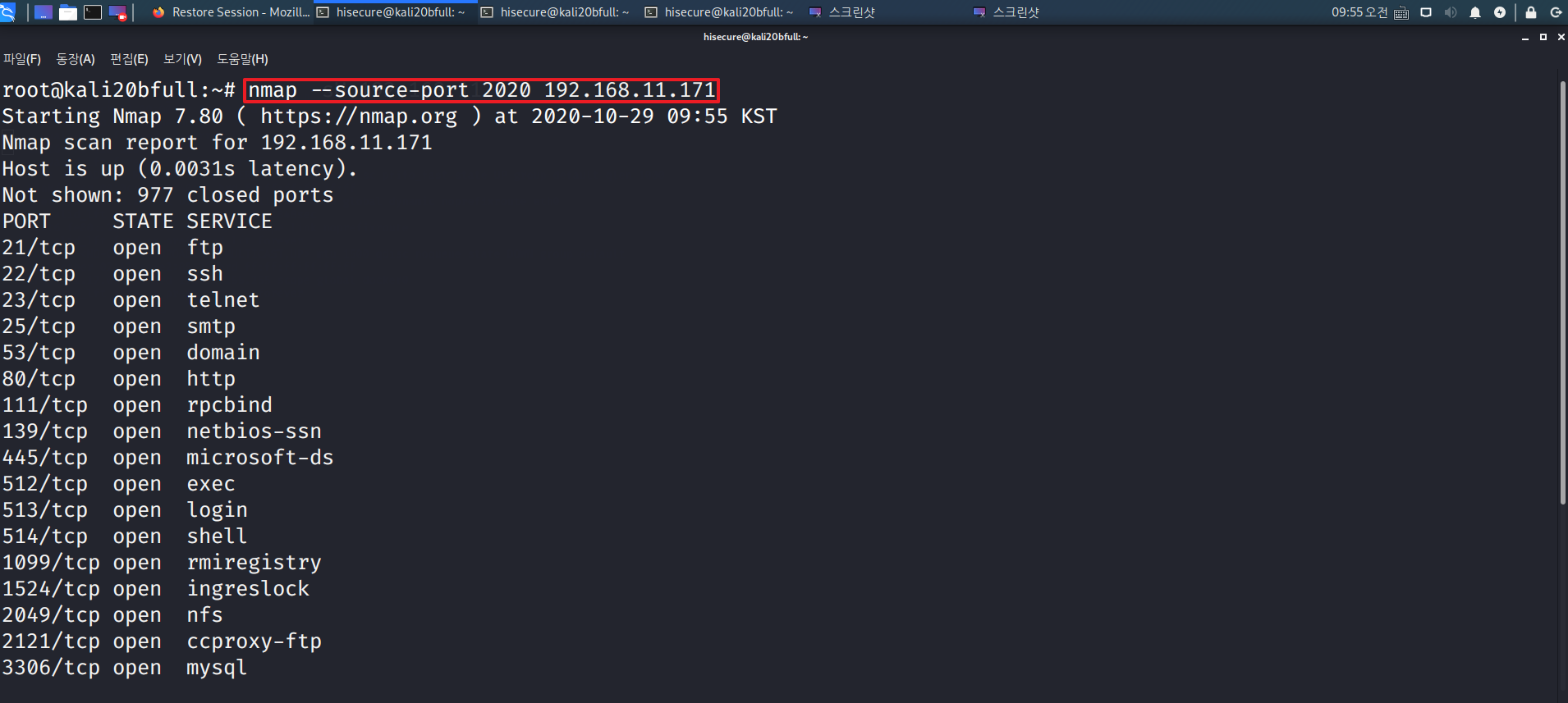 “nmap –open 192.168.11.171” 명령어를 수행하여 열려 있는 포트만 확인 한다. (open)