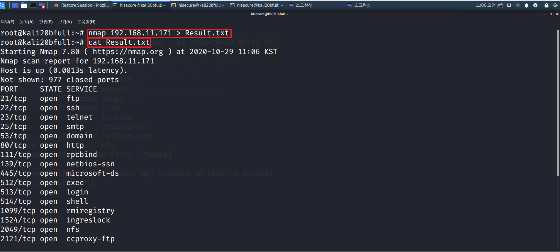 “nmap 192.168.11.171 > Result.txt” 명령어를 수행하여 nmap 스캔 내용을 파일로 저장한다.