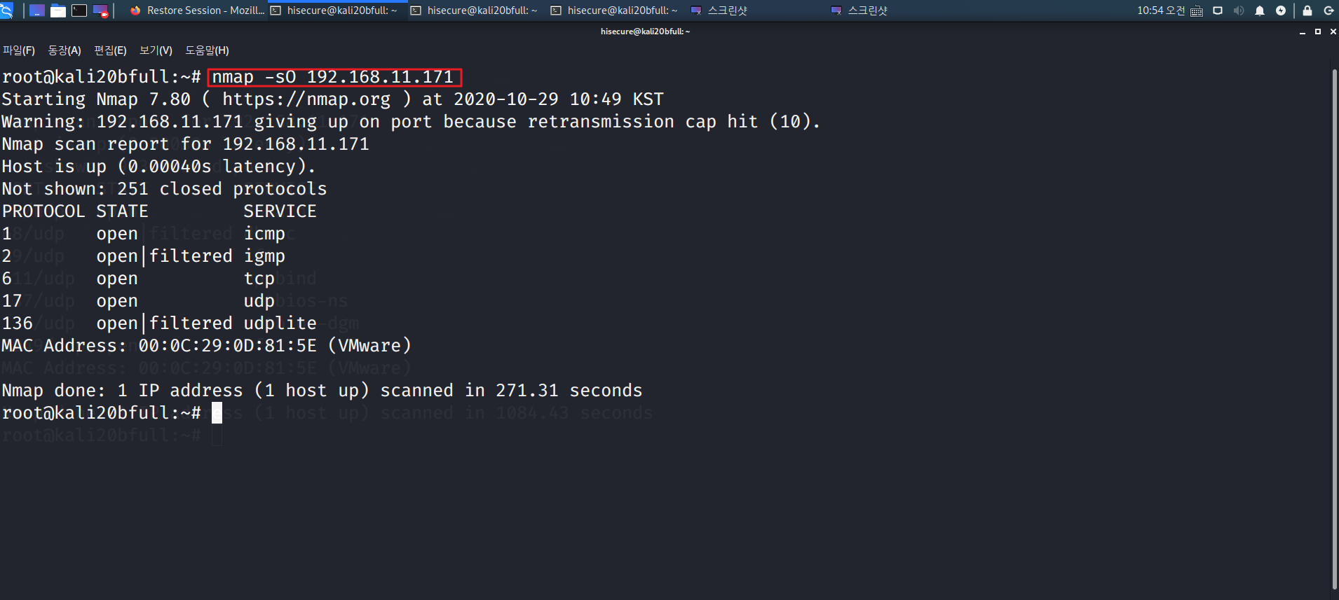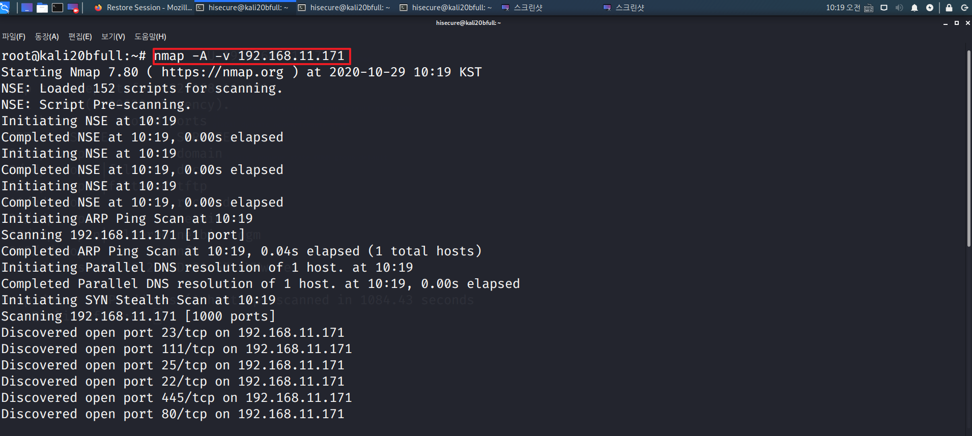 “nmap -vv 192.168.11.171” 명령어를 수행하여 더욱 자세한 옵션을 스캔합니다. (-v 옵션은 -vv 옵션 보다 조금 더 적은 정보를 준다.)