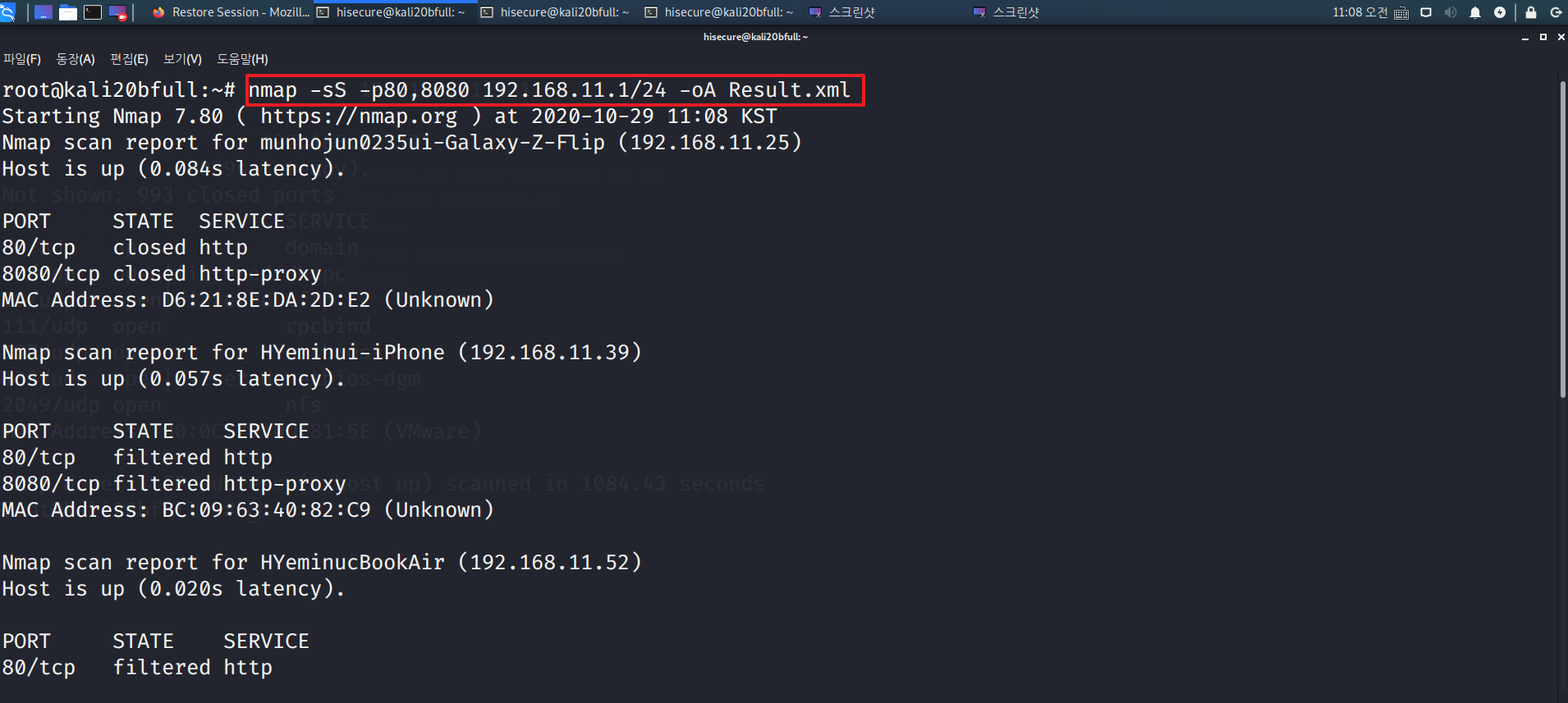 “nmap -sS -p80,8080 192.168.11.1/24 -oA Result.xml” 명령어를 수행하여 대상이 많은 경우 XML 파일로 저장 후 엑셀에서 작업할 수 있다.