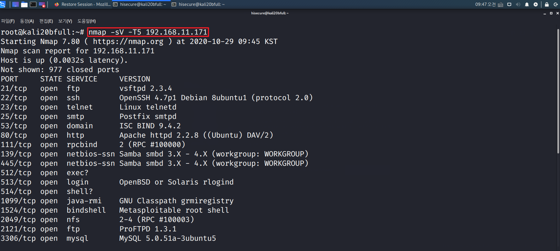 “nmap -sV -T5 IP” 명령어를 수행하여 해당 서버에서 사용하고 있는 여러 서비스(ssh, telnet, mysql등) 버전 파악을 한다. -T5 옵션은 가장 빠른 스캔 속도이며, -T1~-T5까지 존재한다.