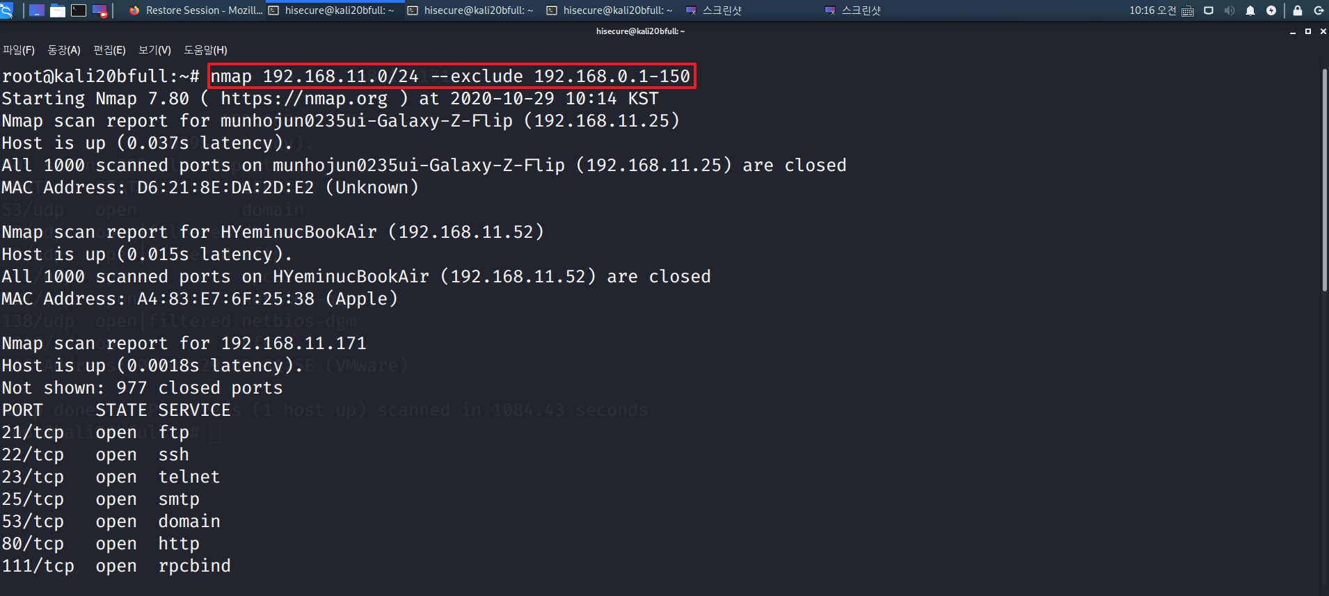 “nmap 192.168.0.11/24 –exclude 192.168.11.1-150” 명령어를 수행하여 탐색 대상에서 특정한 호스트를 제외한다.