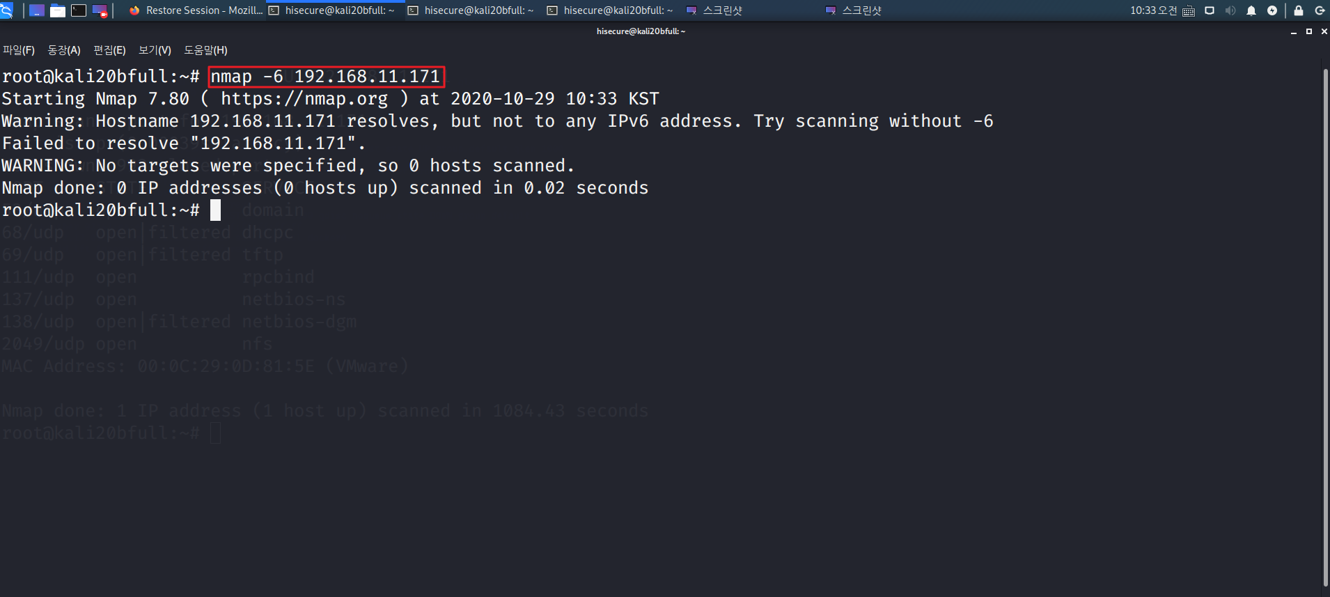 “nmap -6 192.168.11.171” 명령어를 수행하여 IPv6 호스트 스캔을 한다.