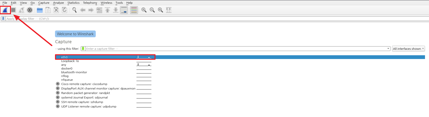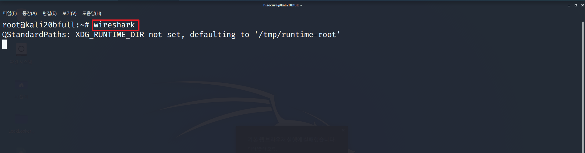 칼리리눅스에는 기본적으로 설치가 되어있기 때문에 커맨드에 “wireshark” 를 입력해주면 된다.