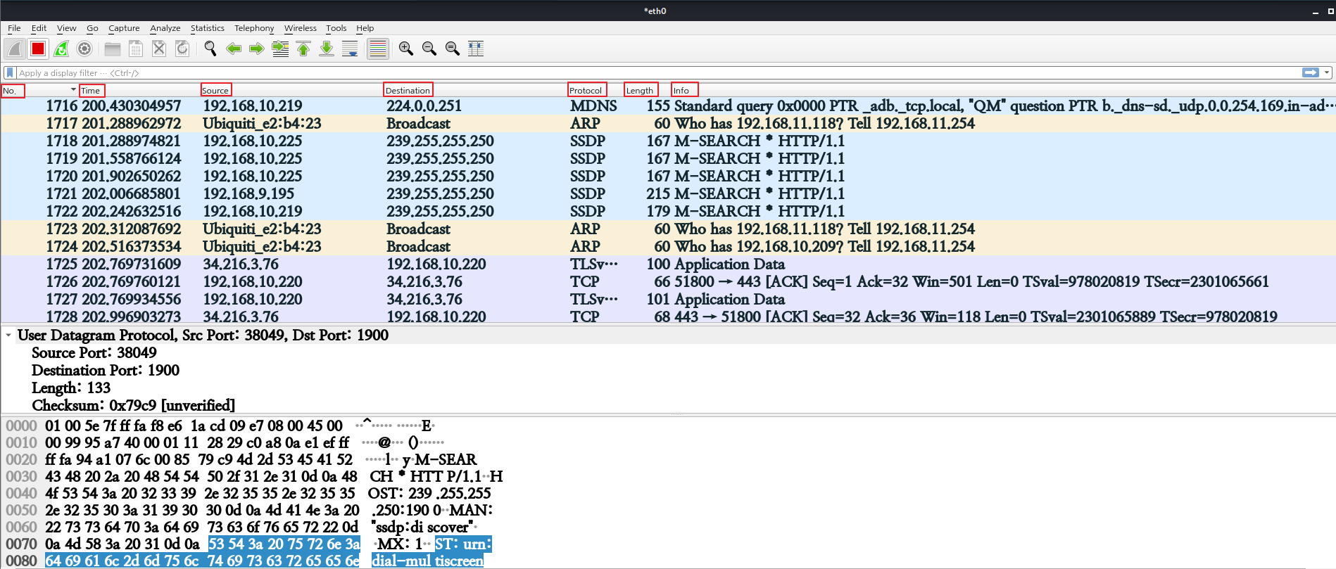 실시간으로 패킷이 오고 가는 모습을 볼 수 있다. No, Time, Source 등 설명은 아래 표 와 같다.