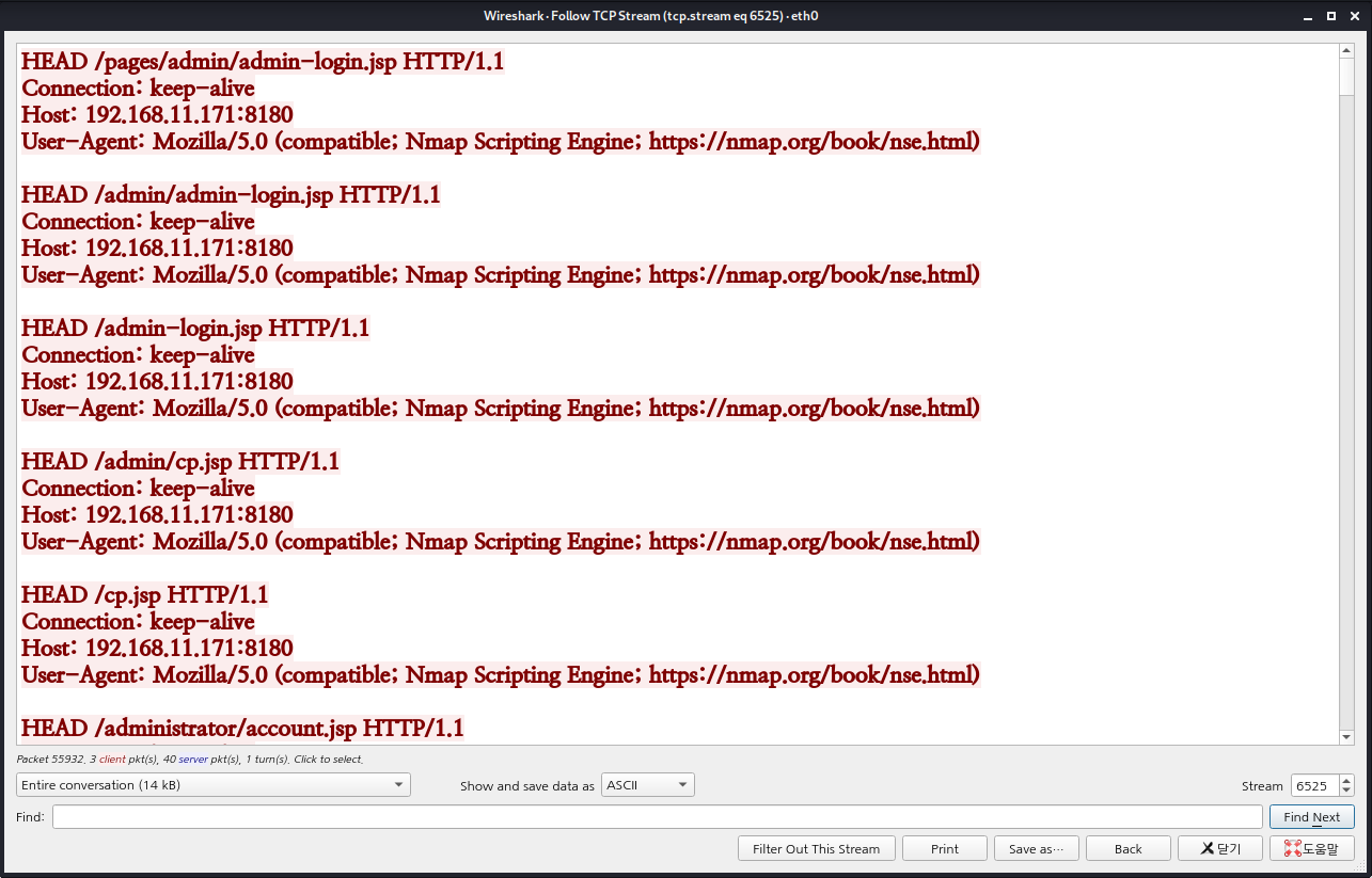 패킷의 정보를 세션별로 조립해서 내용을 볼 수도 있다.