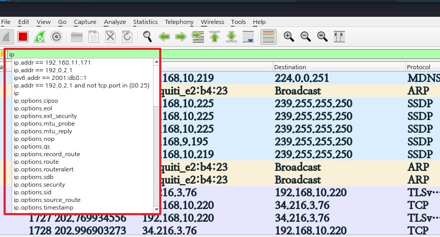 “Apply a display filter”(현재 ip가 적힌 곳) 쓰여 있는 부분에 원하는 필터링 식을 넣어주면 된다. 아래의 필터링 식은 자주 쓰이는 필터링 식이다.