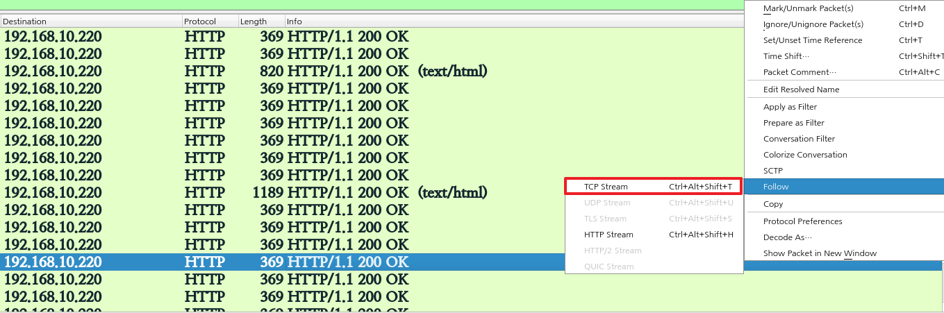 세션별로 조립한 것을 Stream이라한다. TCP Stream, UDP Stream, TLS Stream 등 다양한 Stream등이 있고, 사진에서는 TCP Stream의 예제이다.