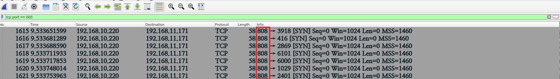 공격자의 출발 포트가 “808”으로 변경된 것을 알 수 있다.