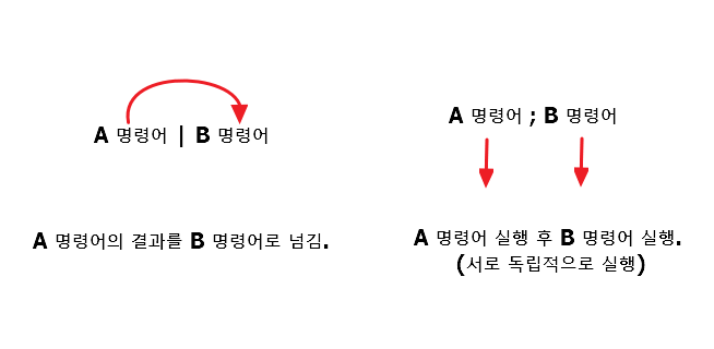 명령을 이어주는 역할은 파이프 ( | ) 와 세미콜론 ( ; ) 이 해준다.
