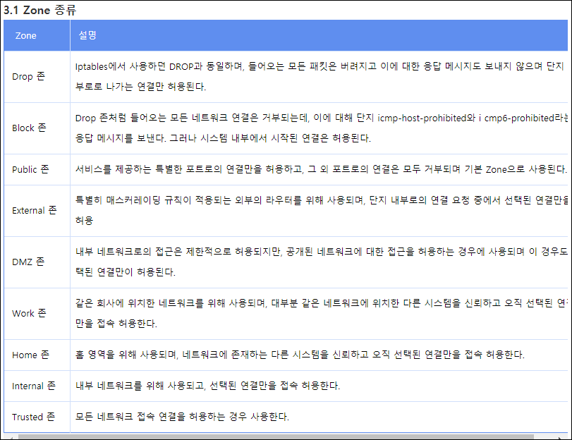# firewall-cmd --get-zones // 등록된 존 확인하기