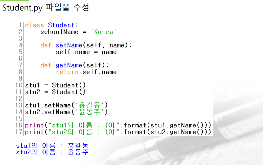 • 메소드 내부에서 self와 함께 선언되면 인스턴스 변수