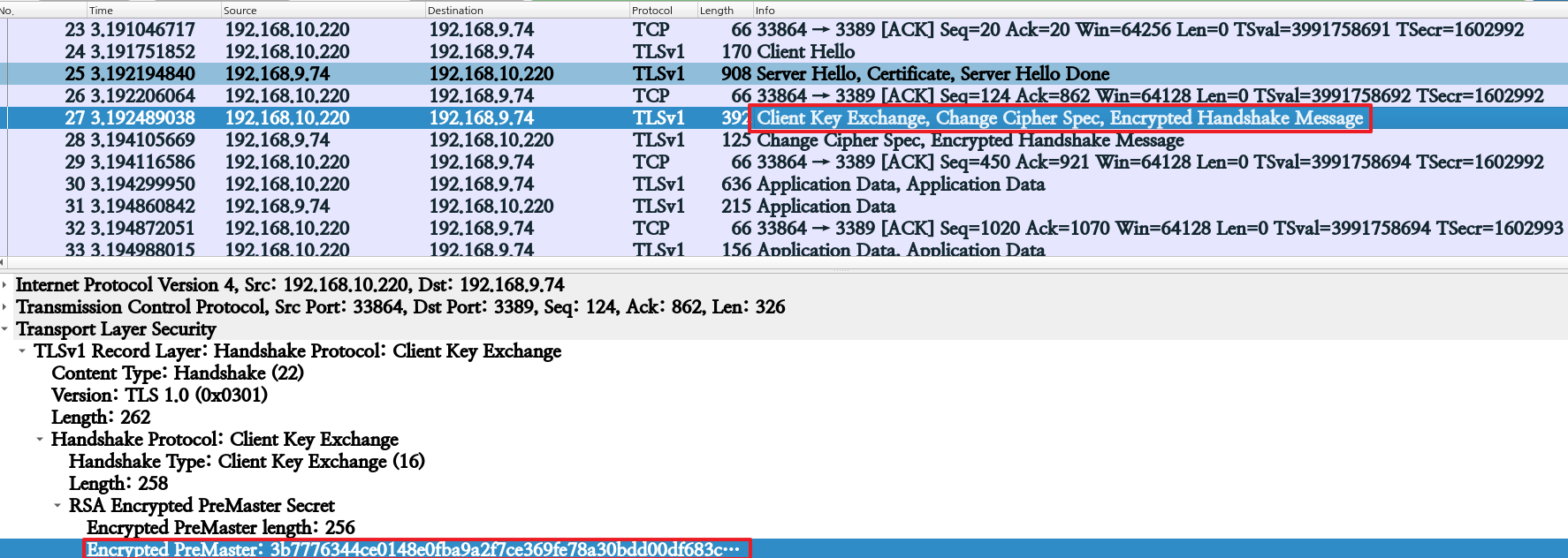 클라이언트는 협상 된 알고리즘과 키를 이용한다 즉 3389포트로 RDP 원격 요청과 SSL/TLS 연결 요청을 하는 것을 확인 할 수 있다.