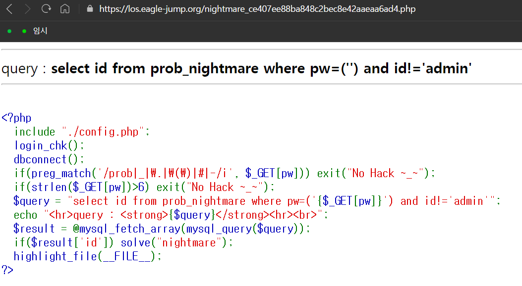select id from prob_nightmare where pw=('')=0;') and id!='admin'