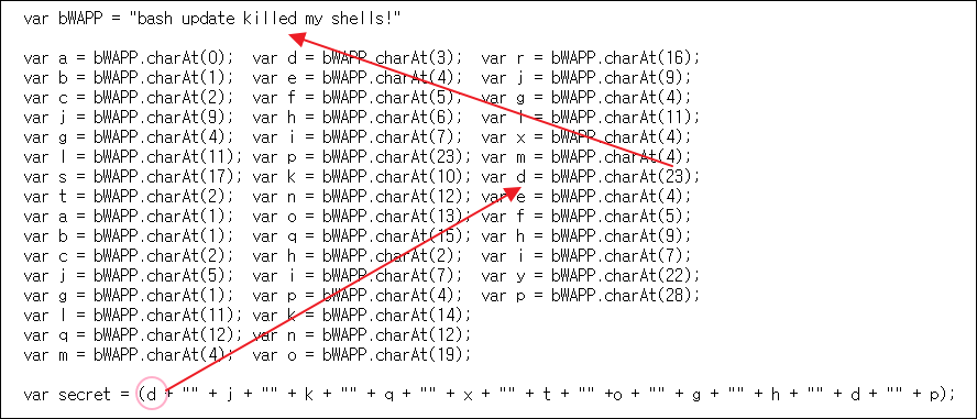즉 'h' 가됨. (위에 있는 var d=bWAPP.charAt(3); 이것은 무시가됨. var d bWAPP.charAt(23);가 나중에 선언되었으니.)