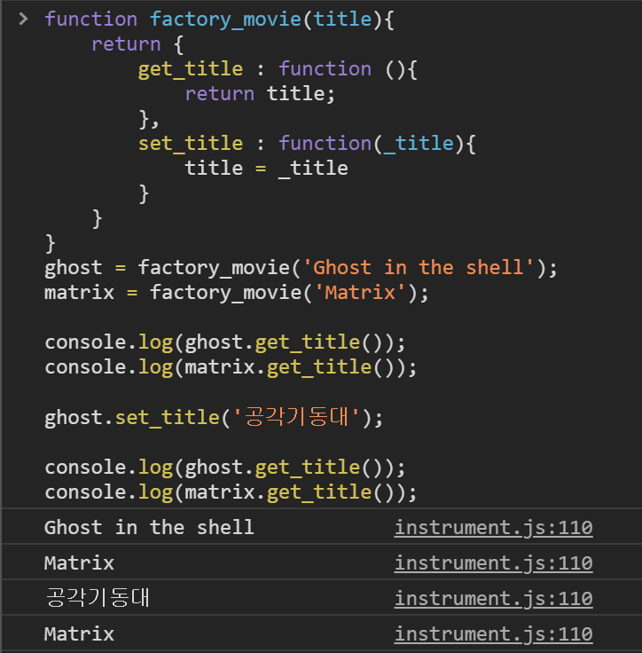 클로저를 이용해서 영화의 제목을 저장하고 있는 객체를 정의하는 예제를 보겠습니다.
