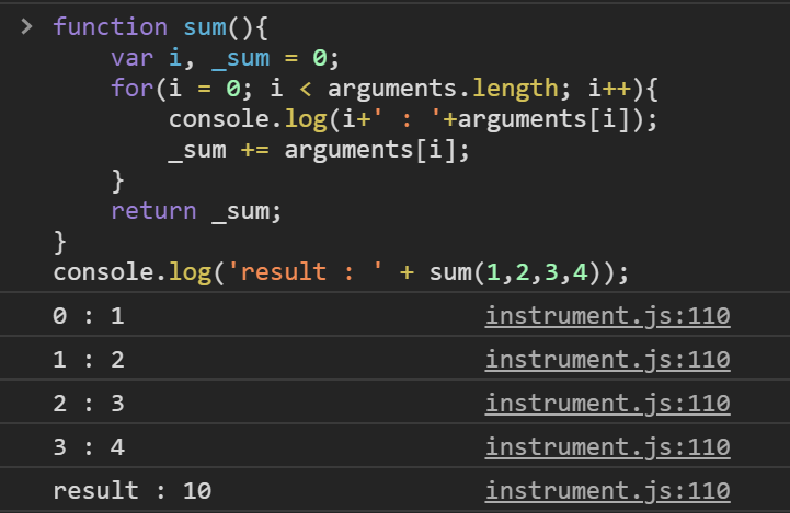 참고로 arguments는 사실 배열은 아니고, 실제로는 arguments 객체의 인스턴스라고 할 수 있습니다.