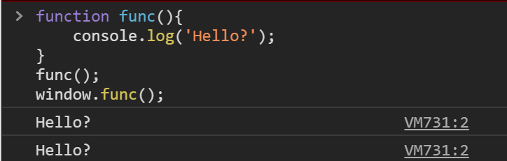4행의 func(); 과 5행의 window.func() 가 같은 결과값을 출력하고 있는 것을 확인할 수 있습니다.