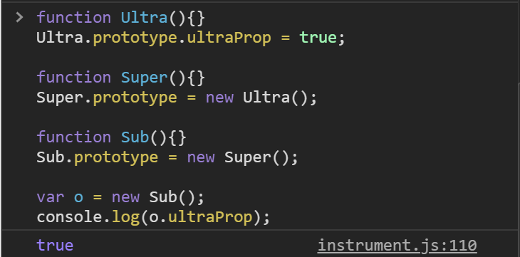 생성자 Sub를 통해서 만들어진 객체 o가 Ultra의 프로퍼티 ultraProp에 접근 가능합니다.