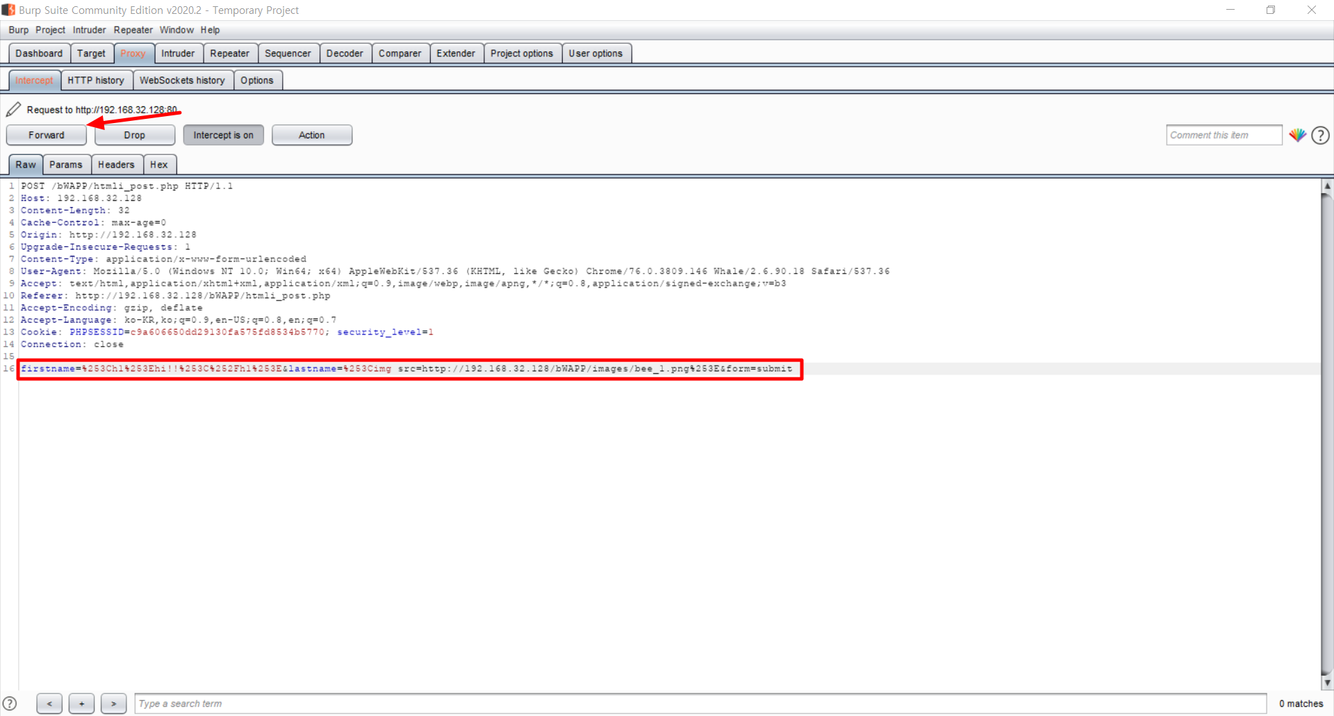 이것에 악성코드를 작성하여 주입하여 Forward 버튼을 눌러 요청을 보내면