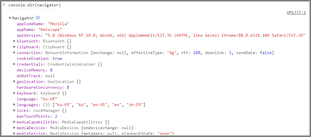 아래는 Navigator 객체에서 중요하게 쓰이는 프로퍼티입니다.