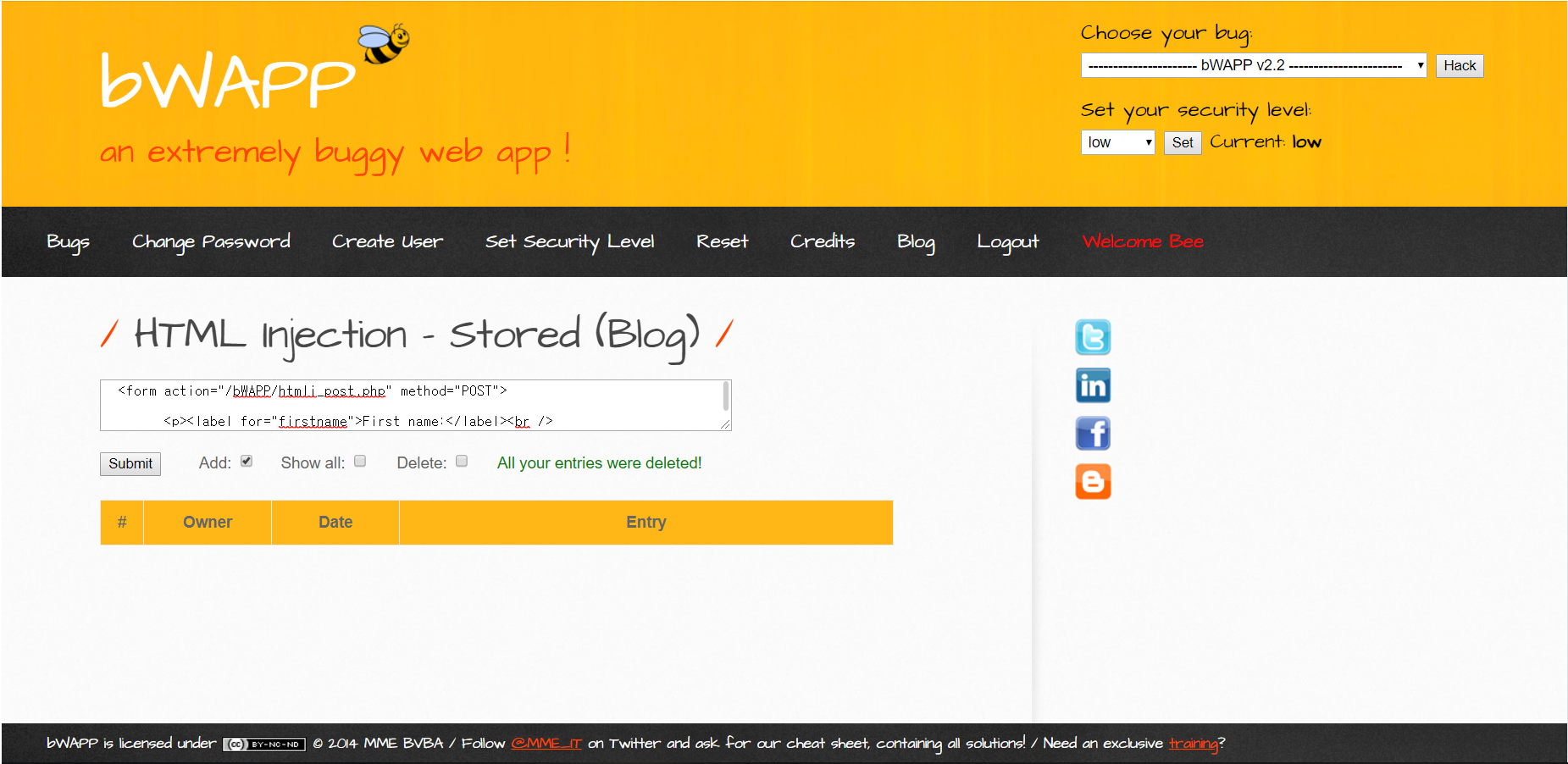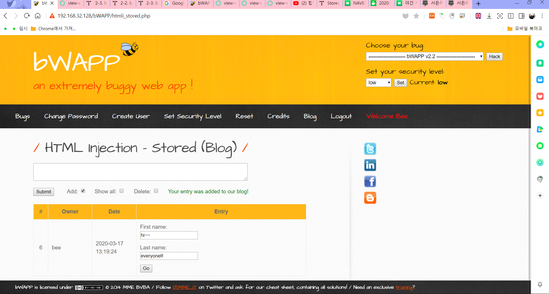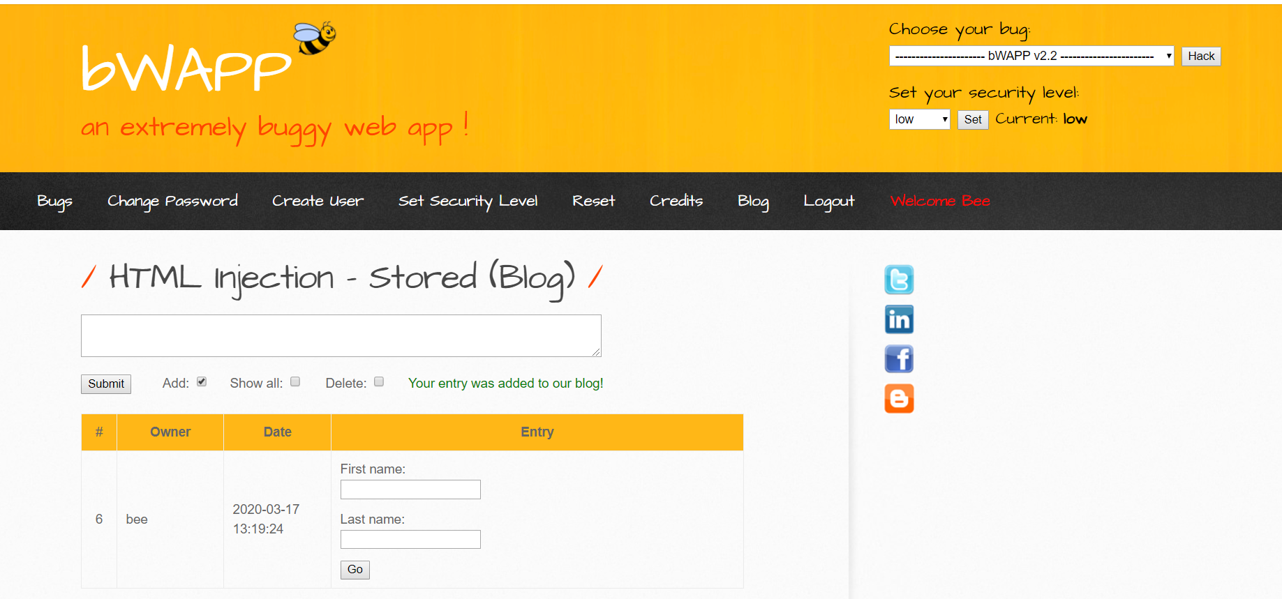 bee-box의 html injection은 블로그에서 발생하는데요 HTML 태그를 블로그에 저장하여