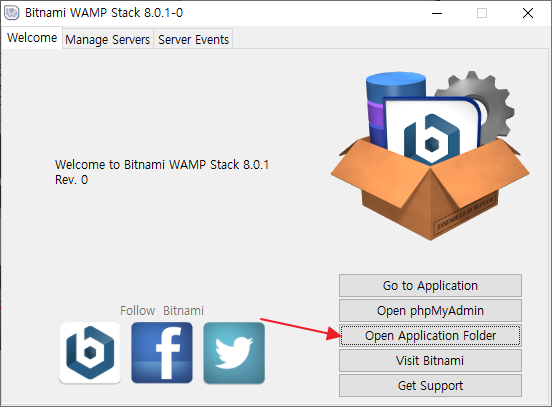 "Open Application Folder" 를 누르면 Bitnami가 설치된 폴더가 출력됩니다.