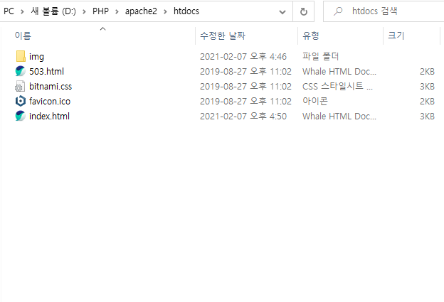 apache2\htdocs에 웹 기본 경로로 설정되어있습니다.