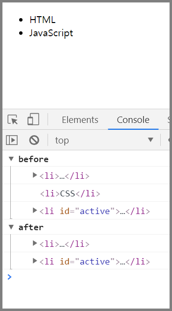 after 그룹을 보면, parentNode.removeChild() 메소드가 보입니다.
